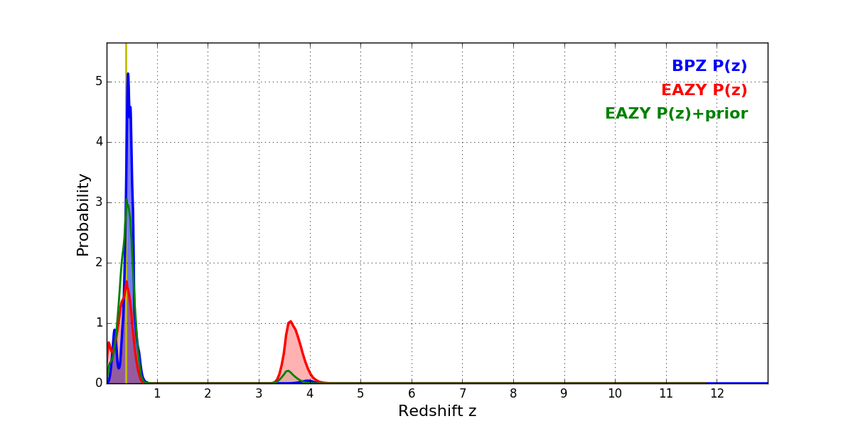 In P(z) plots: Yellow lines mark the cluster redshift z = 0.390,