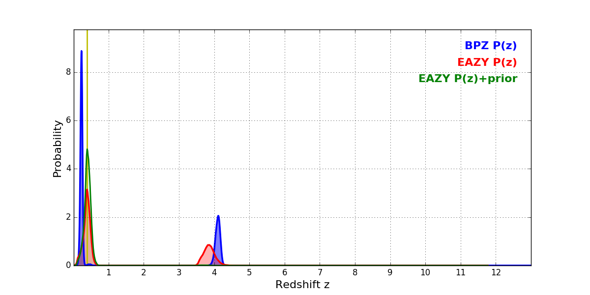 In P(z) plots: Yellow lines mark the cluster redshift z = 0.390,