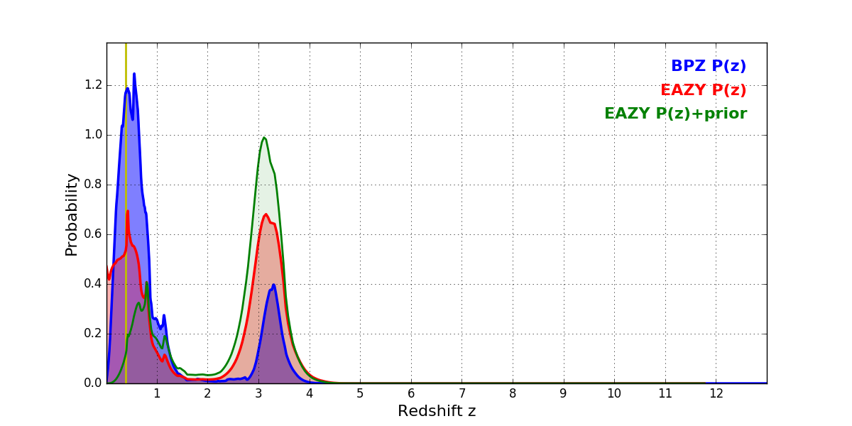 In P(z) plots: Yellow lines mark the cluster redshift z = 0.390,