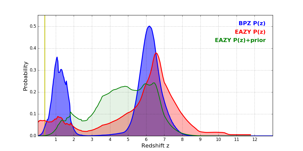 In P(z) plots: Yellow lines mark the cluster redshift z = 0.390,