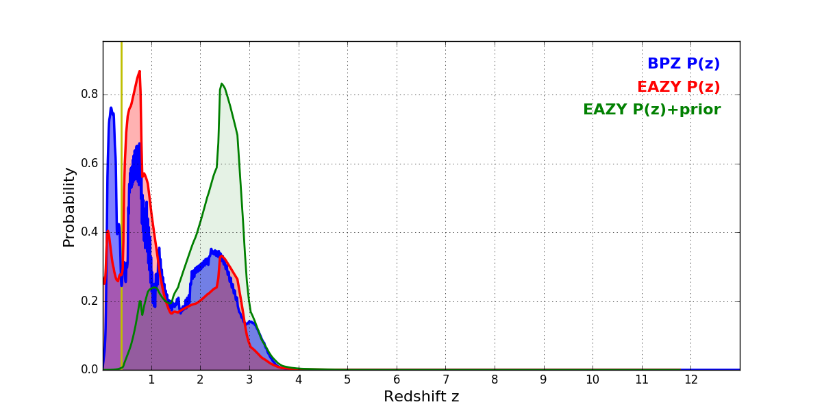 In P(z) plots: Yellow lines mark the cluster redshift z = 0.390,