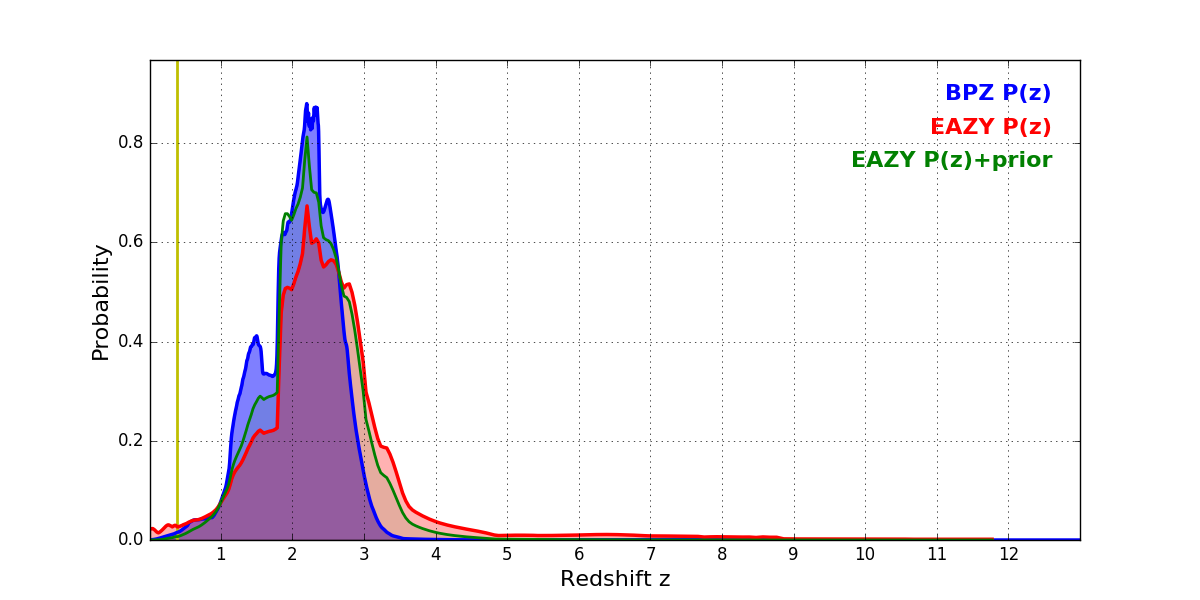 In P(z) plots: Yellow lines mark the cluster redshift z = 0.390,