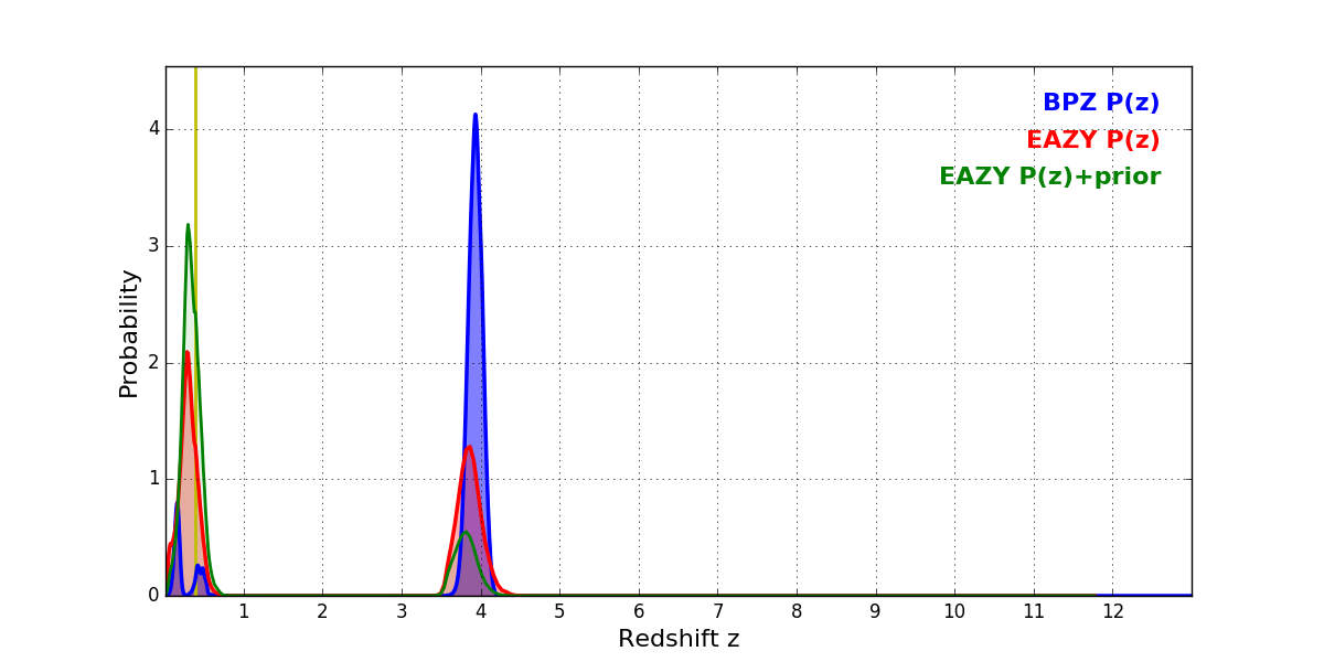 In P(z) plots: Yellow lines mark the cluster redshift z = 0.390,