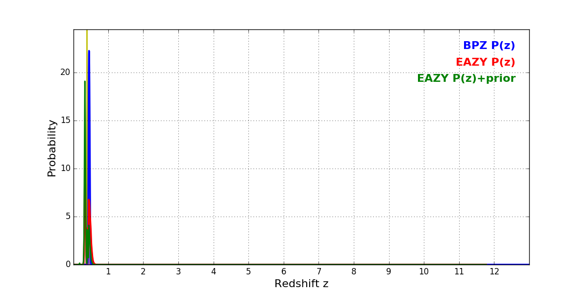 In P(z) plots: Yellow lines mark the cluster redshift z = 0.390,