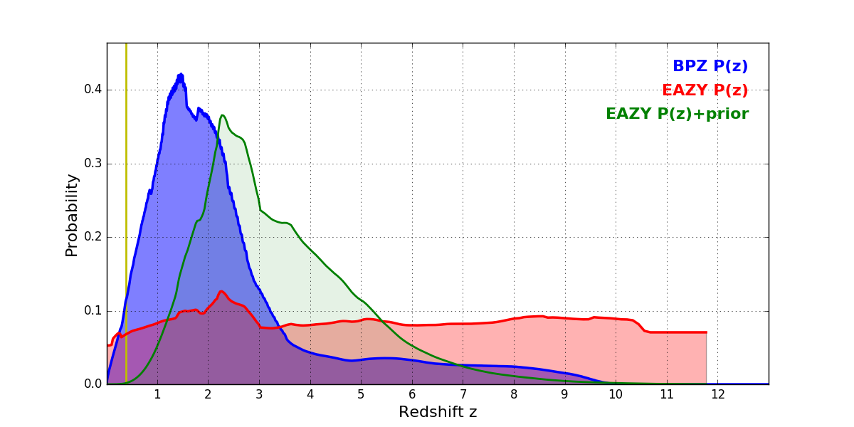 In P(z) plots: Yellow lines mark the cluster redshift z = 0.390,