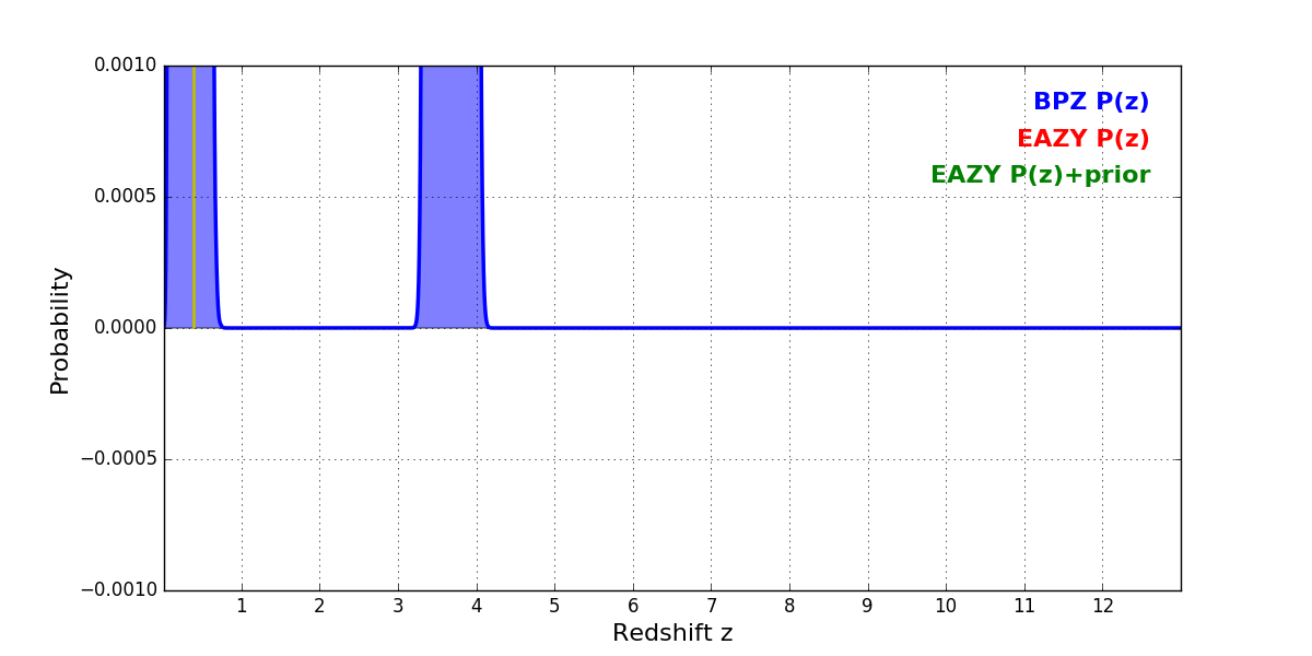 In P(z) plots: Yellow lines mark the cluster redshift z = 0.390,