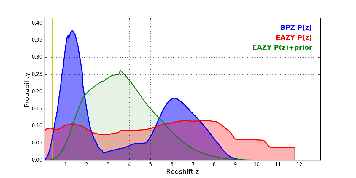 In P(z) plots: Yellow lines mark the cluster redshift z = 0.390,