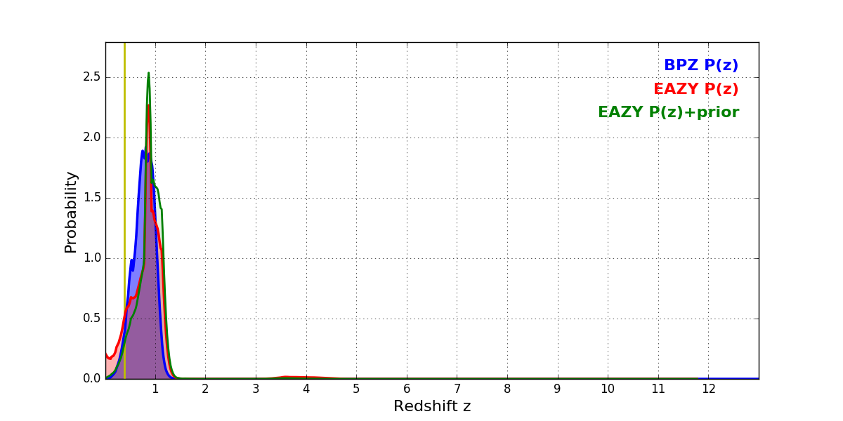 In P(z) plots: Yellow lines mark the cluster redshift z = 0.390,