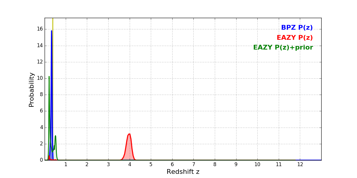 In P(z) plots: Yellow lines mark the cluster redshift z = 0.390,