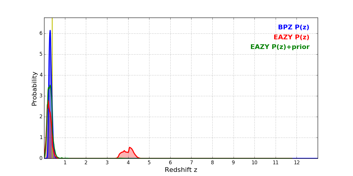 In P(z) plots: Yellow lines mark the cluster redshift z = 0.390,