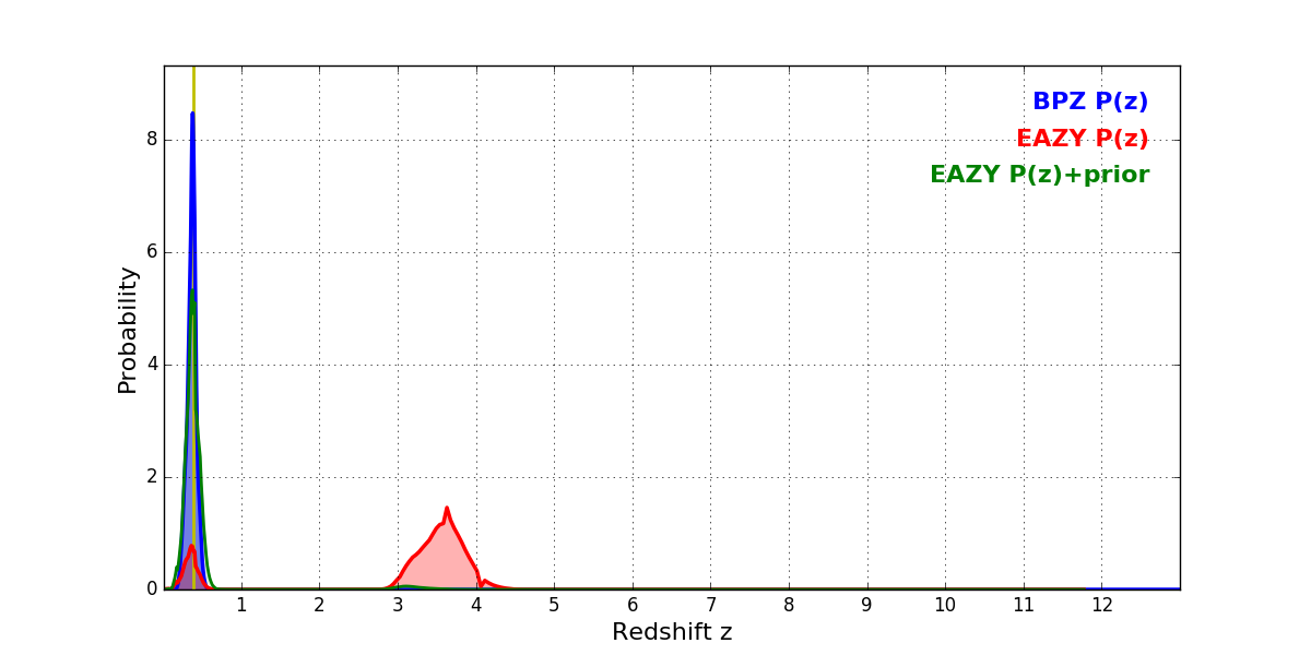 In P(z) plots: Yellow lines mark the cluster redshift z = 0.390,