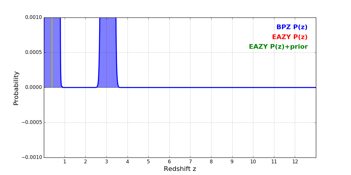 In P(z) plots: Yellow lines mark the cluster redshift z = 0.390,