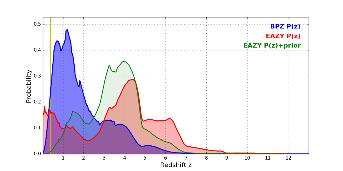 In P(z) plots: Yellow lines mark the cluster redshift z = 0.390,