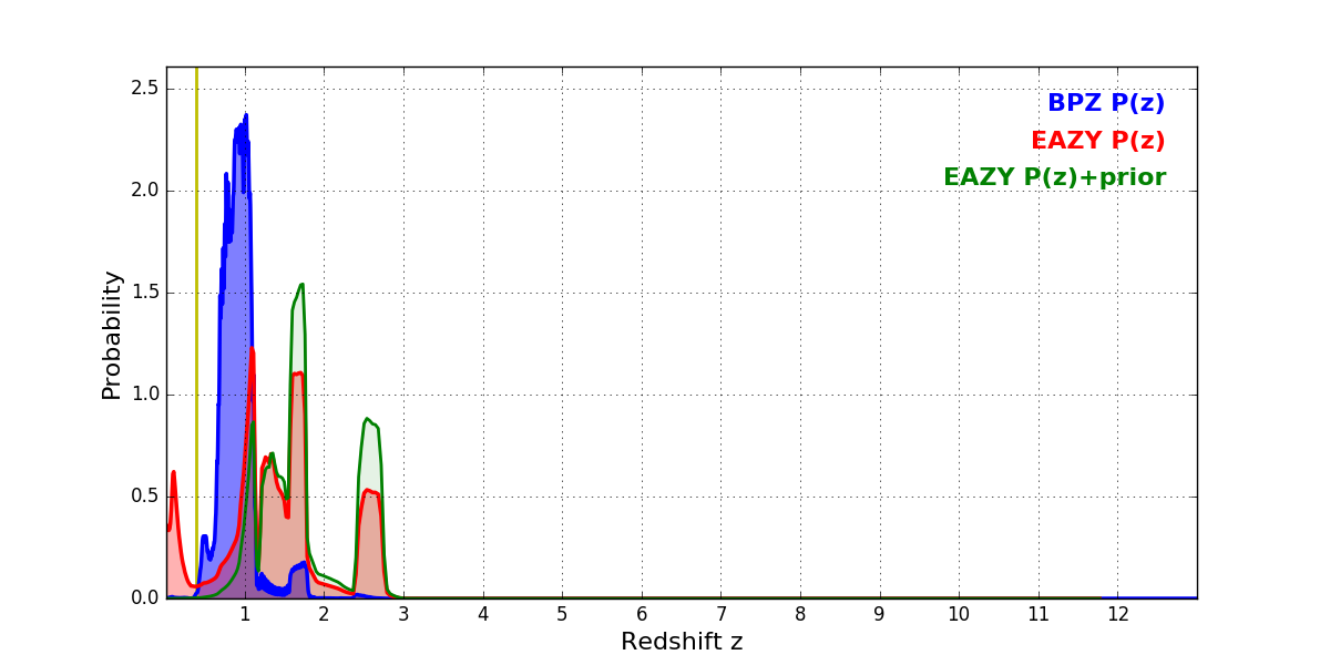 In P(z) plots: Yellow lines mark the cluster redshift z = 0.390,