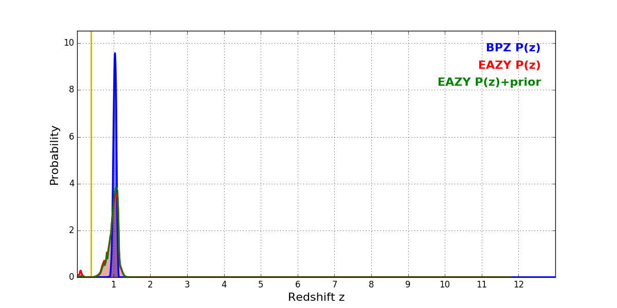 In P(z) plots: Yellow lines mark the cluster redshift z = 0.390,