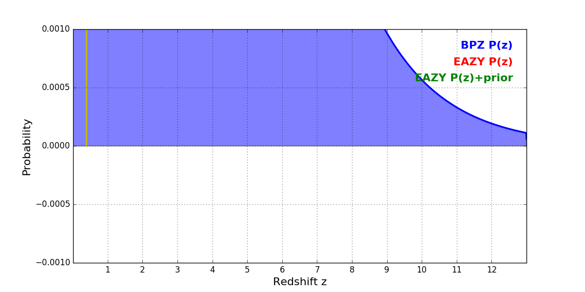 In P(z) plots: Yellow lines mark the cluster redshift z = 0.390,