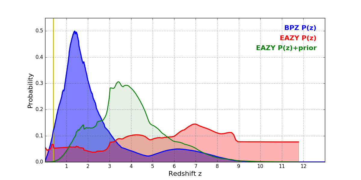 In P(z) plots: Yellow lines mark the cluster redshift z = 0.390,