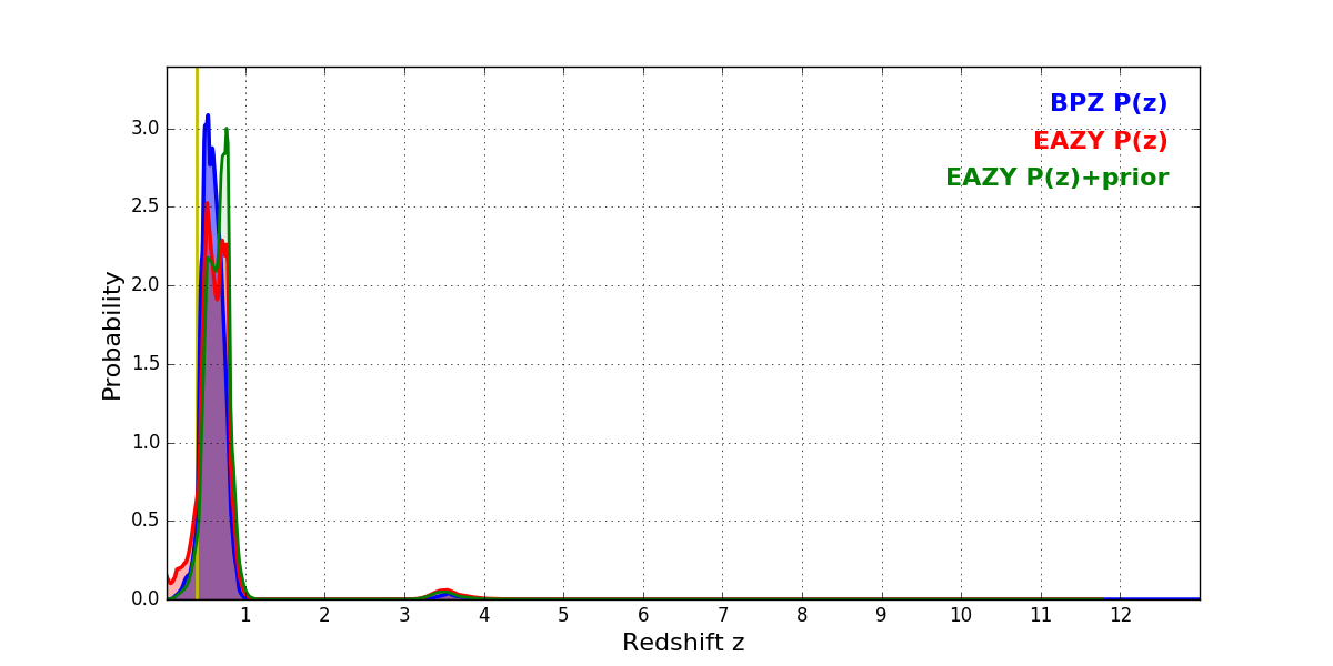 In P(z) plots: Yellow lines mark the cluster redshift z = 0.390,