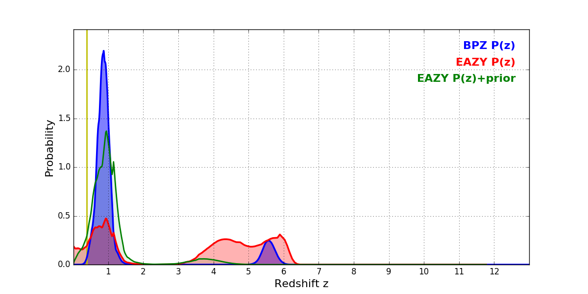 In P(z) plots: Yellow lines mark the cluster redshift z = 0.390,