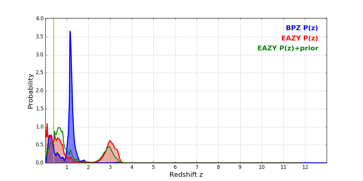 In P(z) plots: Yellow lines mark the cluster redshift z = 0.390,