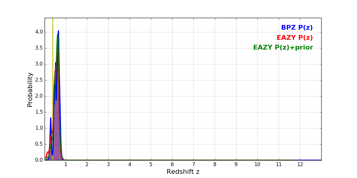 In P(z) plots: Yellow lines mark the cluster redshift z = 0.390,