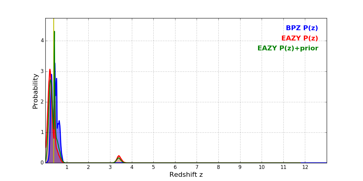 In P(z) plots: Yellow lines mark the cluster redshift z = 0.390,