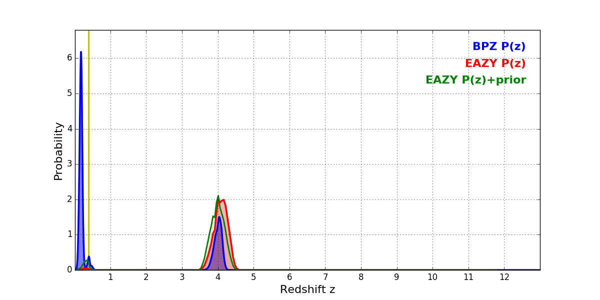 In P(z) plots: Yellow lines mark the cluster redshift z = 0.390,