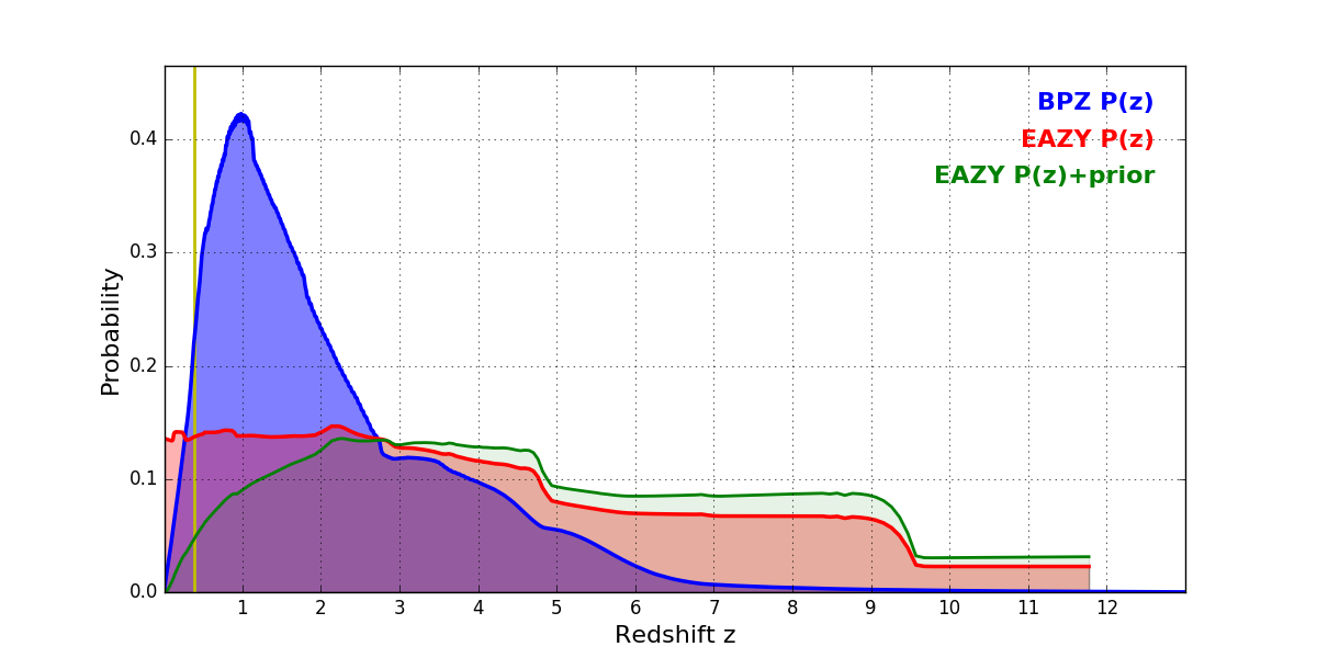 In P(z) plots: Yellow lines mark the cluster redshift z = 0.390,
