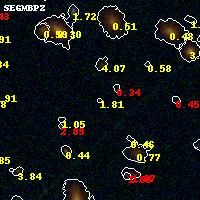Black segments are analyzed here. Roll mouse over color images to view segments. Best viewed in a wide browser window (1200 pixels or more). Download SED & P(z) plots to view larger versions.