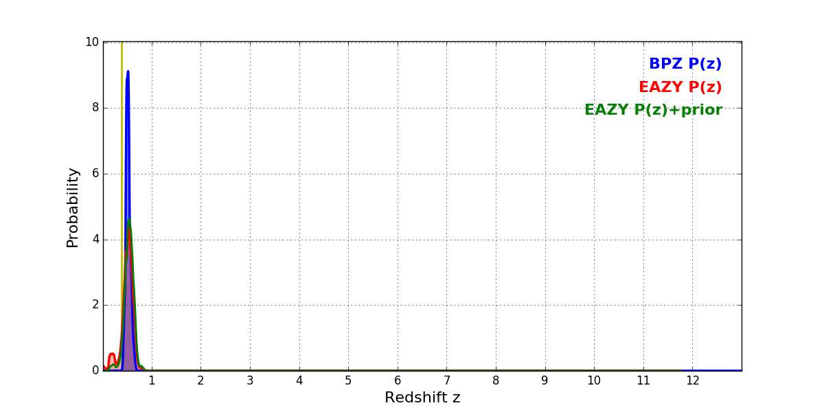 In P(z) plots: Yellow lines mark the cluster redshift z = 0.390,
