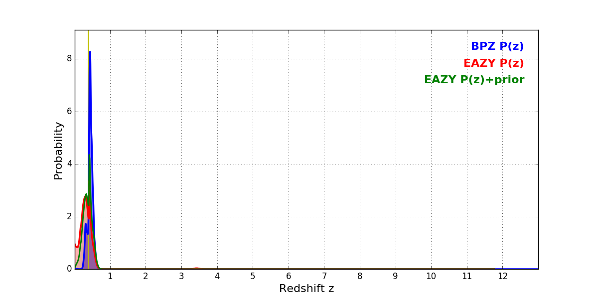 In P(z) plots: Yellow lines mark the cluster redshift z = 0.390,