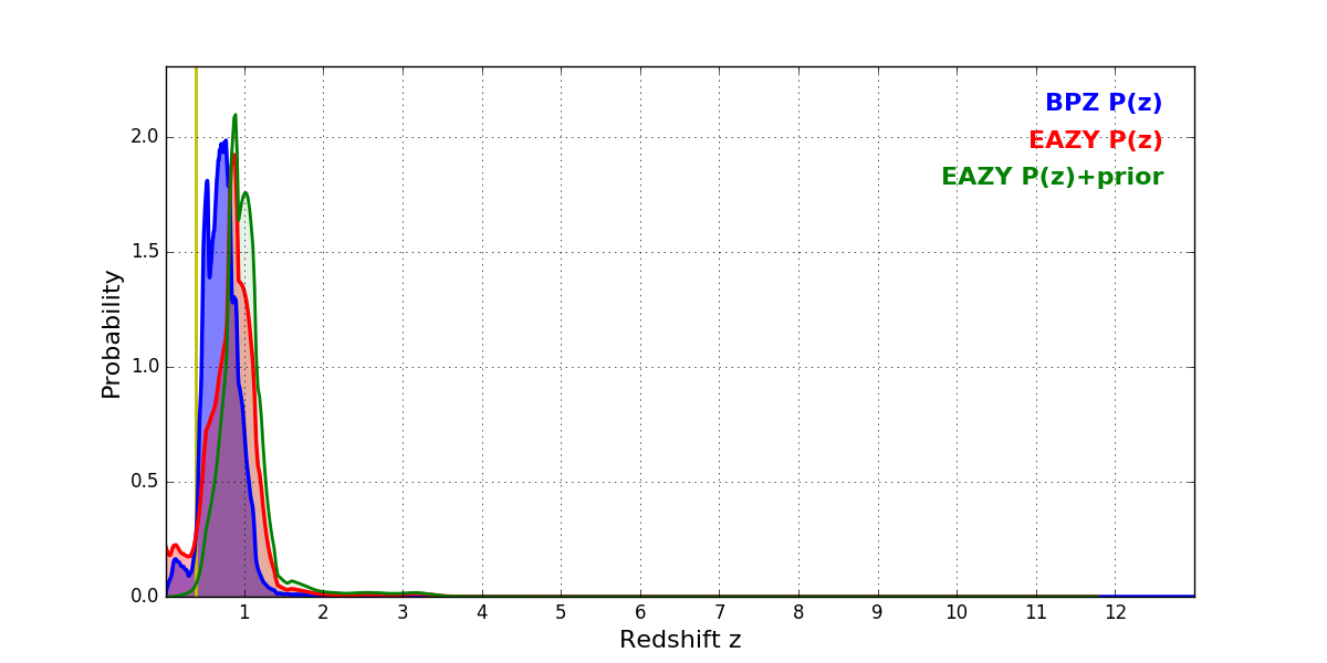 In P(z) plots: Yellow lines mark the cluster redshift z = 0.390,