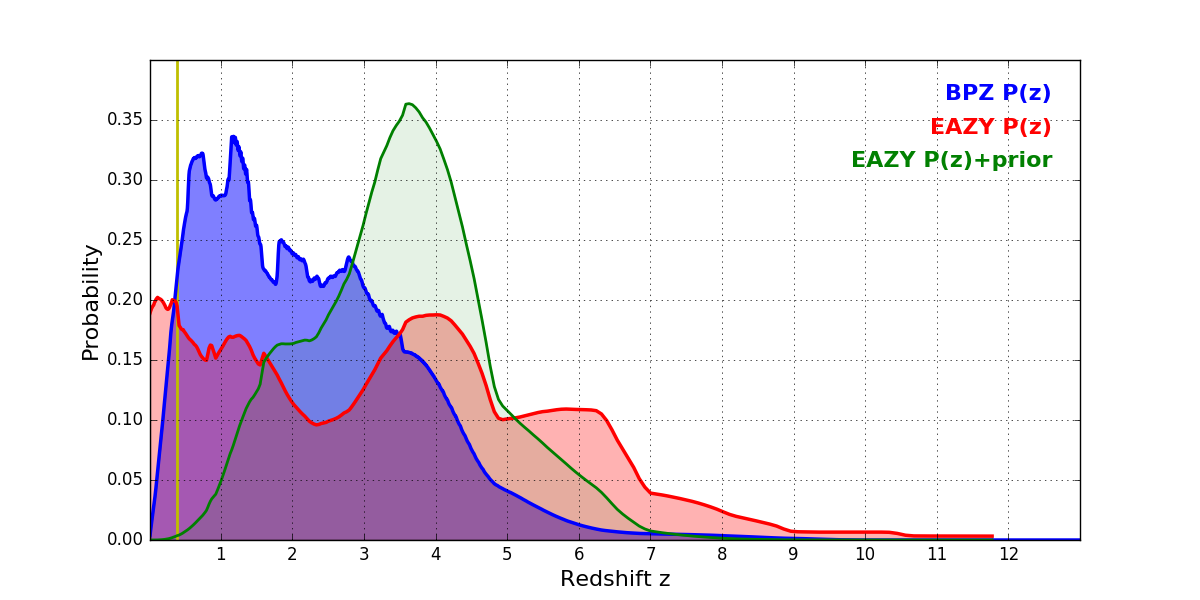 In P(z) plots: Yellow lines mark the cluster redshift z = 0.390,