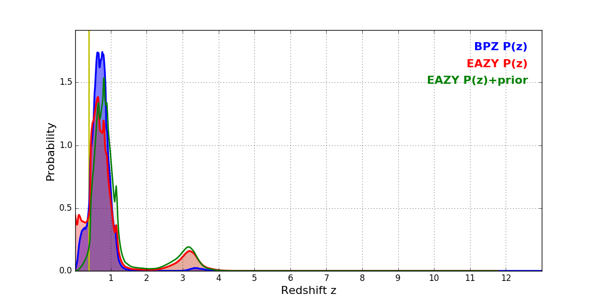 In P(z) plots: Yellow lines mark the cluster redshift z = 0.390,