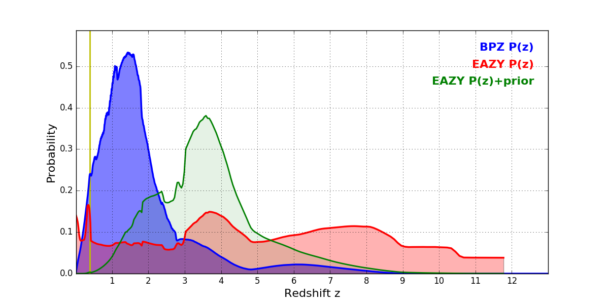 In P(z) plots: Yellow lines mark the cluster redshift z = 0.390,