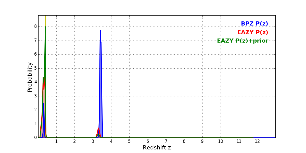 In P(z) plots: Yellow lines mark the cluster redshift z = 0.390,