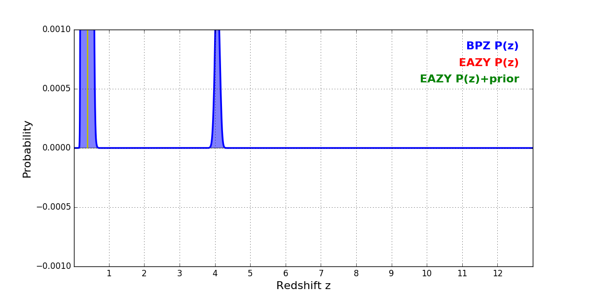 In P(z) plots: Yellow lines mark the cluster redshift z = 0.390,