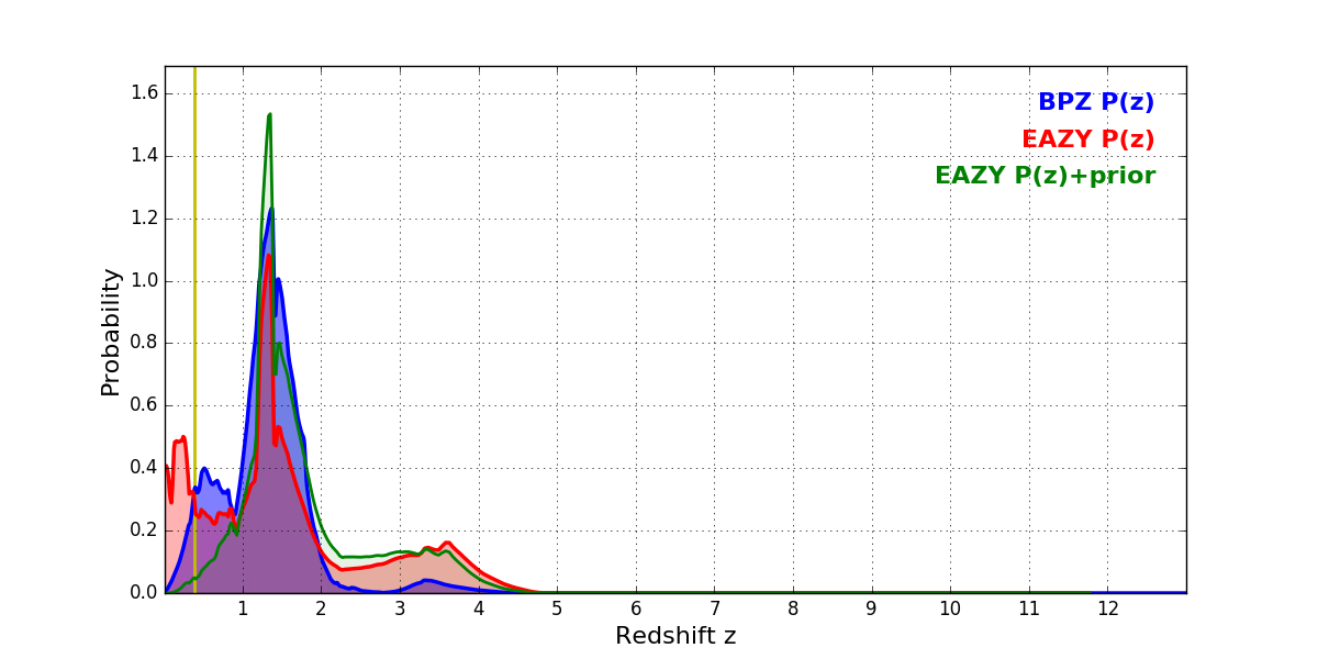 In P(z) plots: Yellow lines mark the cluster redshift z = 0.390,