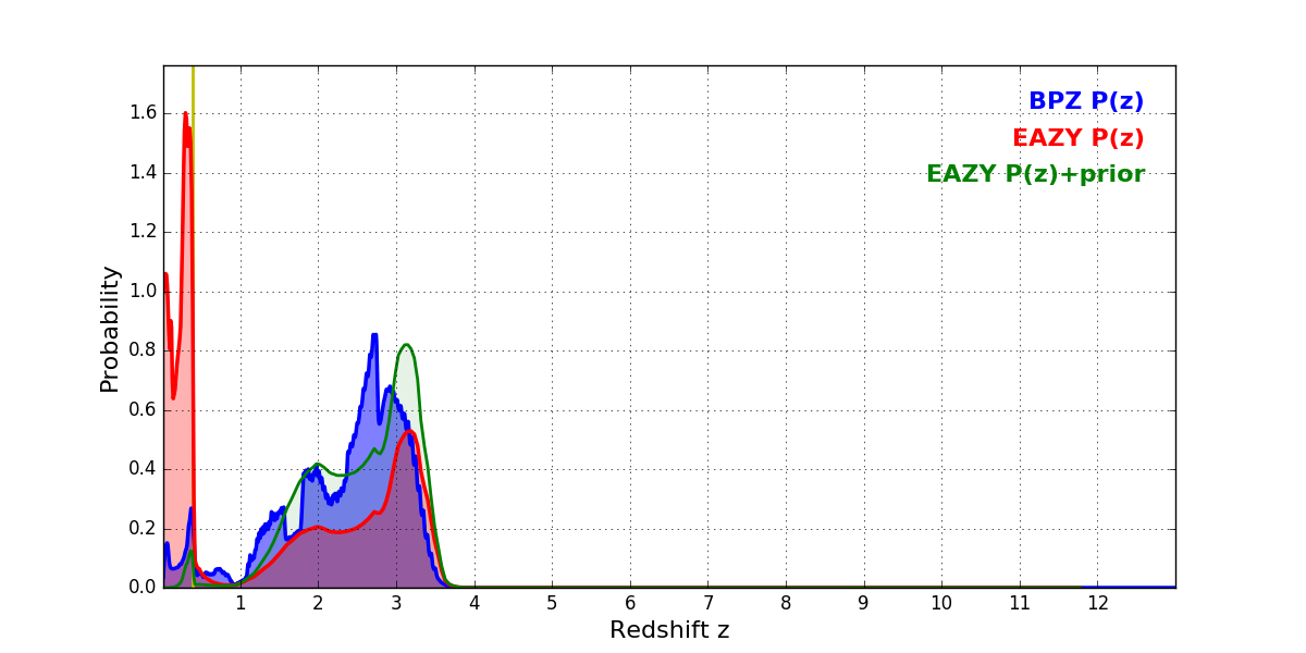 In P(z) plots: Yellow lines mark the cluster redshift z = 0.390,