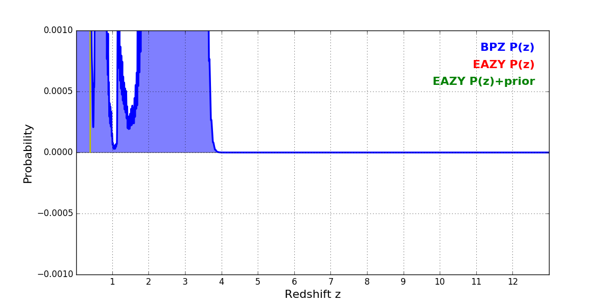 In P(z) plots: Yellow lines mark the cluster redshift z = 0.390,