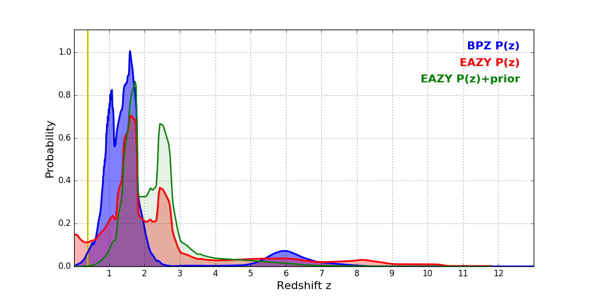 In P(z) plots: Yellow lines mark the cluster redshift z = 0.390,