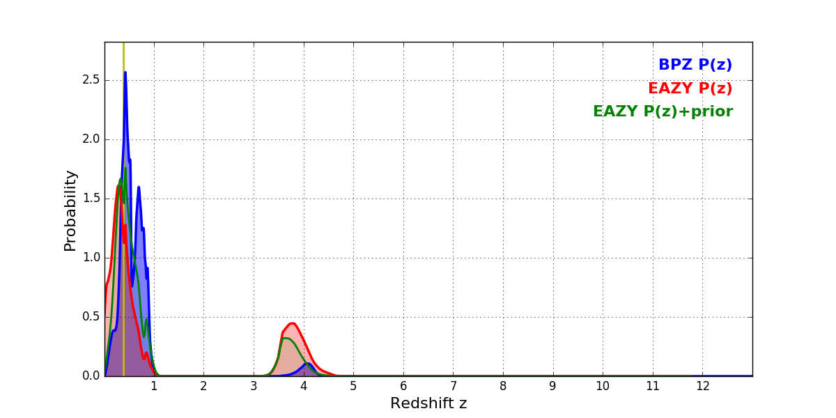 In P(z) plots: Yellow lines mark the cluster redshift z = 0.390,