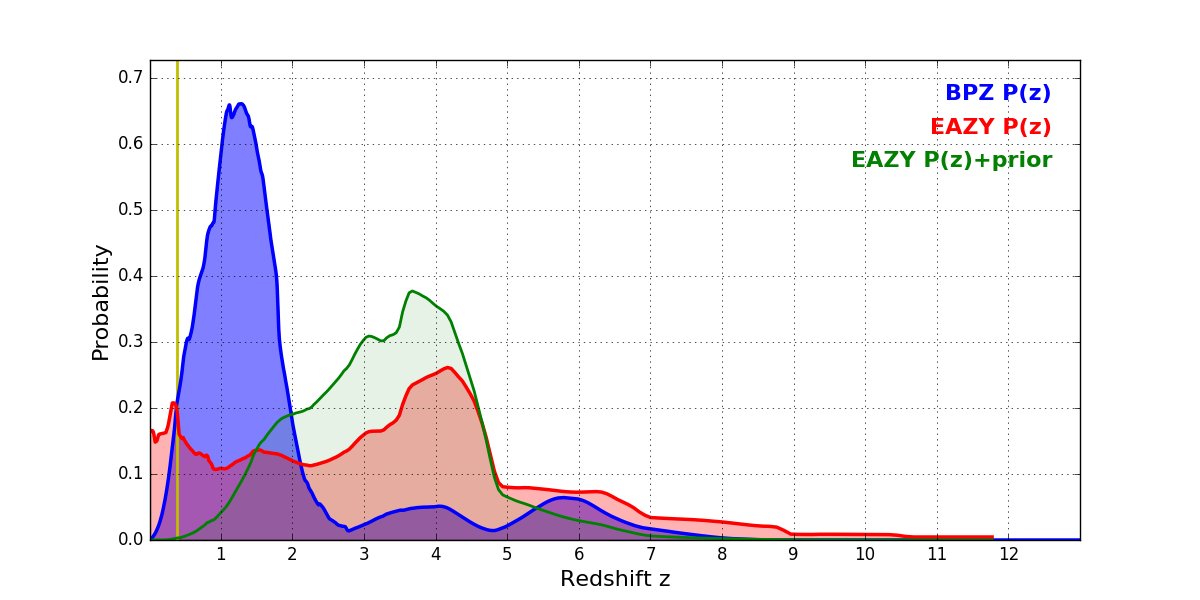 In P(z) plots: Yellow lines mark the cluster redshift z = 0.390,