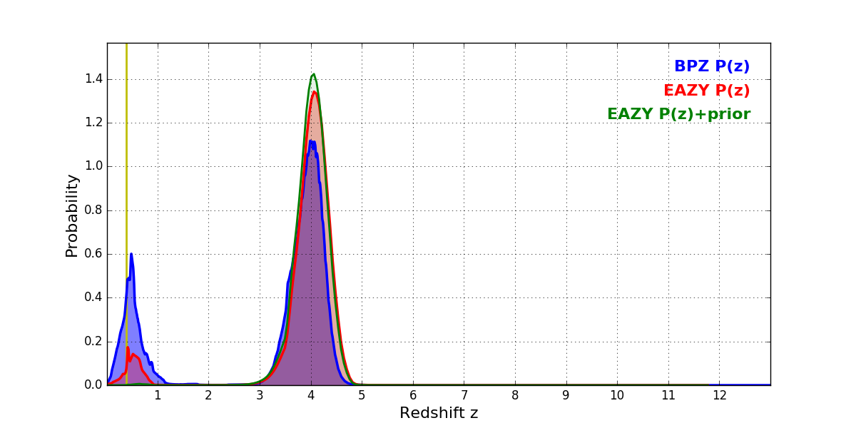 In P(z) plots: Yellow lines mark the cluster redshift z = 0.390,