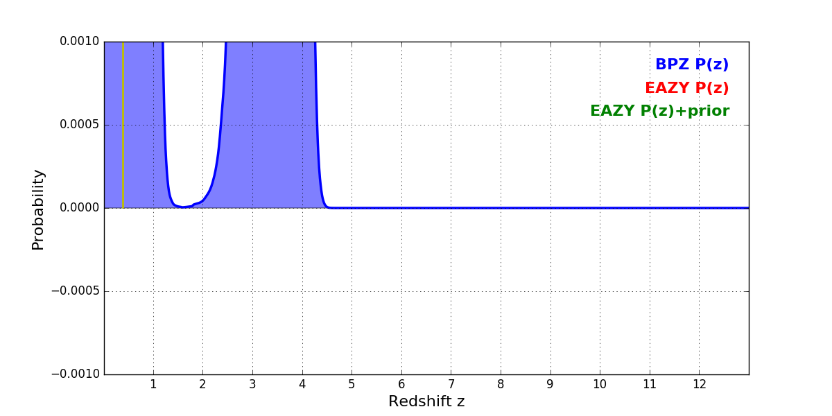 In P(z) plots: Yellow lines mark the cluster redshift z = 0.390,