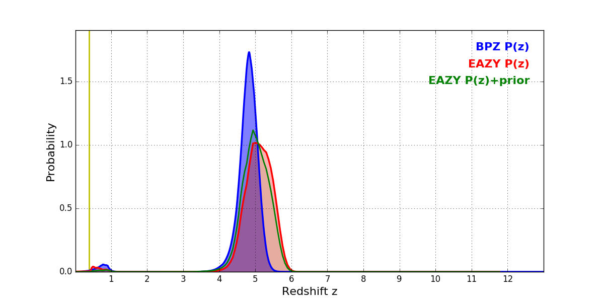 In P(z) plots: Yellow lines mark the cluster redshift z = 0.390,