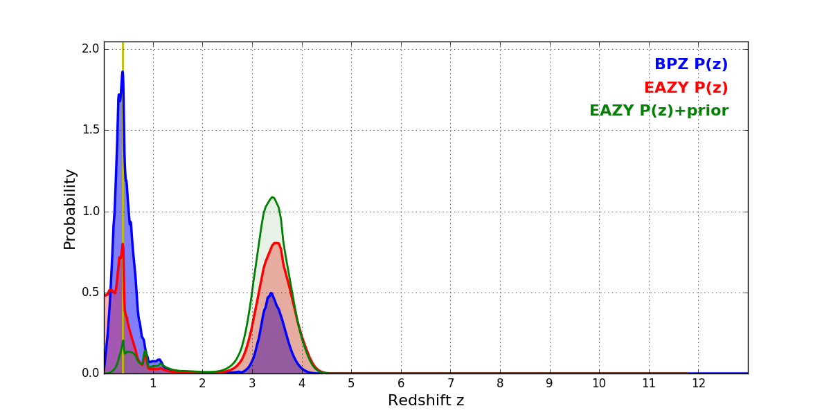 In P(z) plots: Yellow lines mark the cluster redshift z = 0.390,