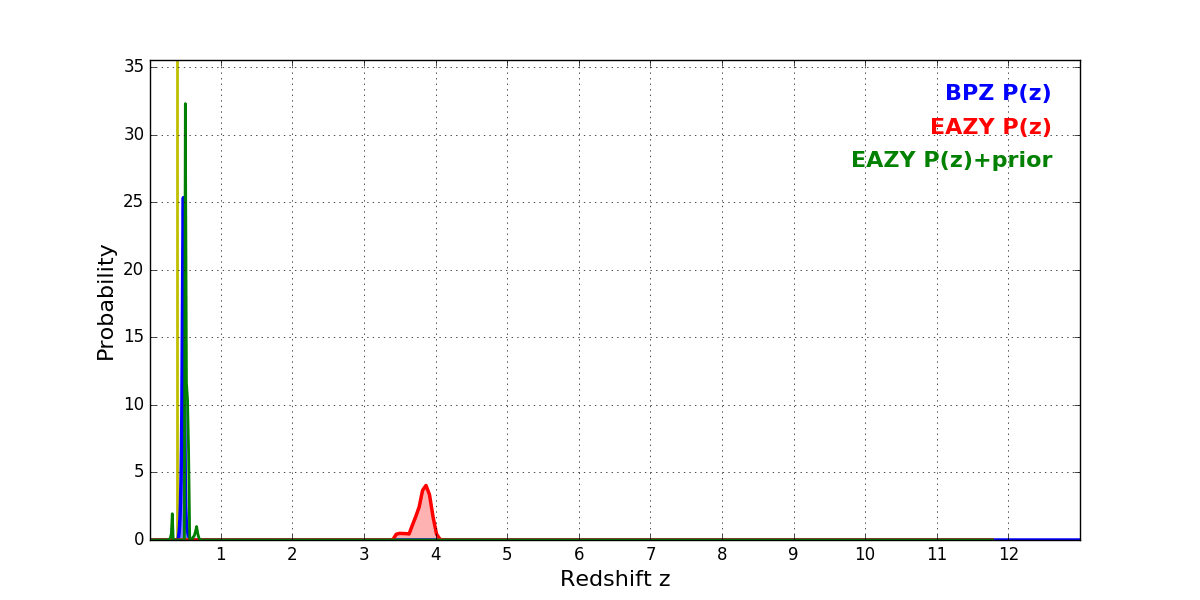 In P(z) plots: Yellow lines mark the cluster redshift z = 0.390,
