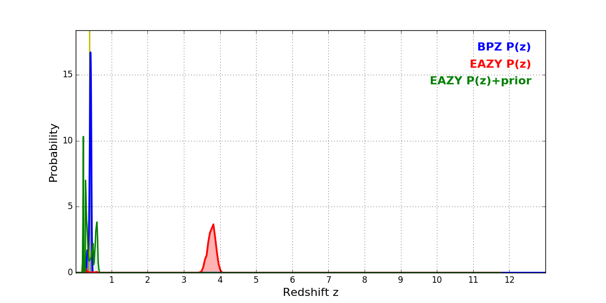 In P(z) plots: Yellow lines mark the cluster redshift z = 0.390,