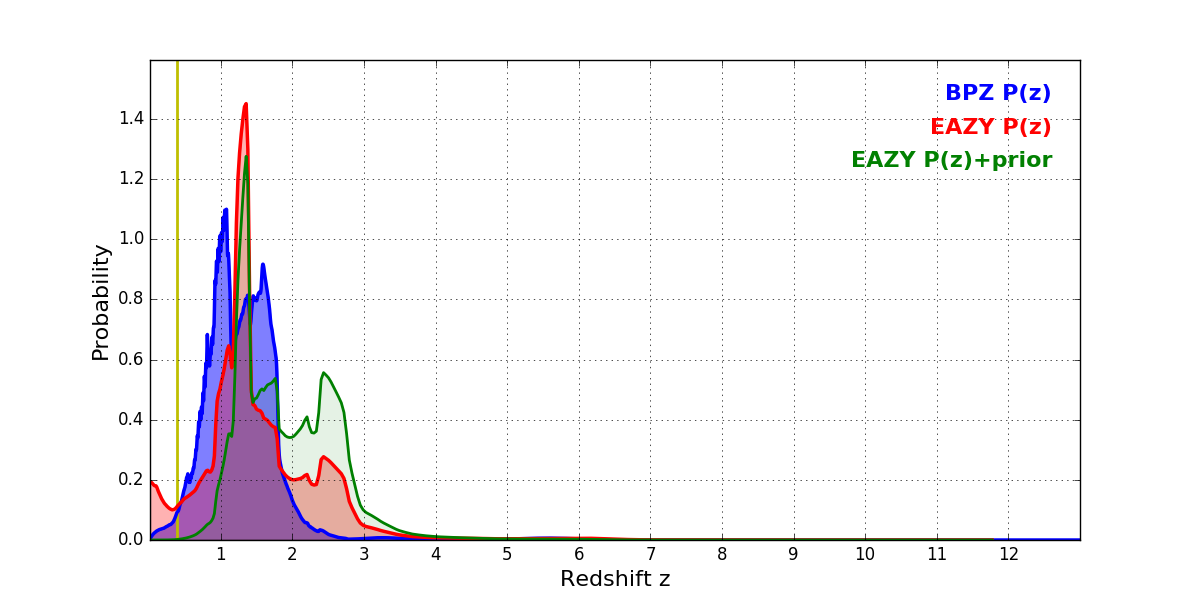 In P(z) plots: Yellow lines mark the cluster redshift z = 0.390,